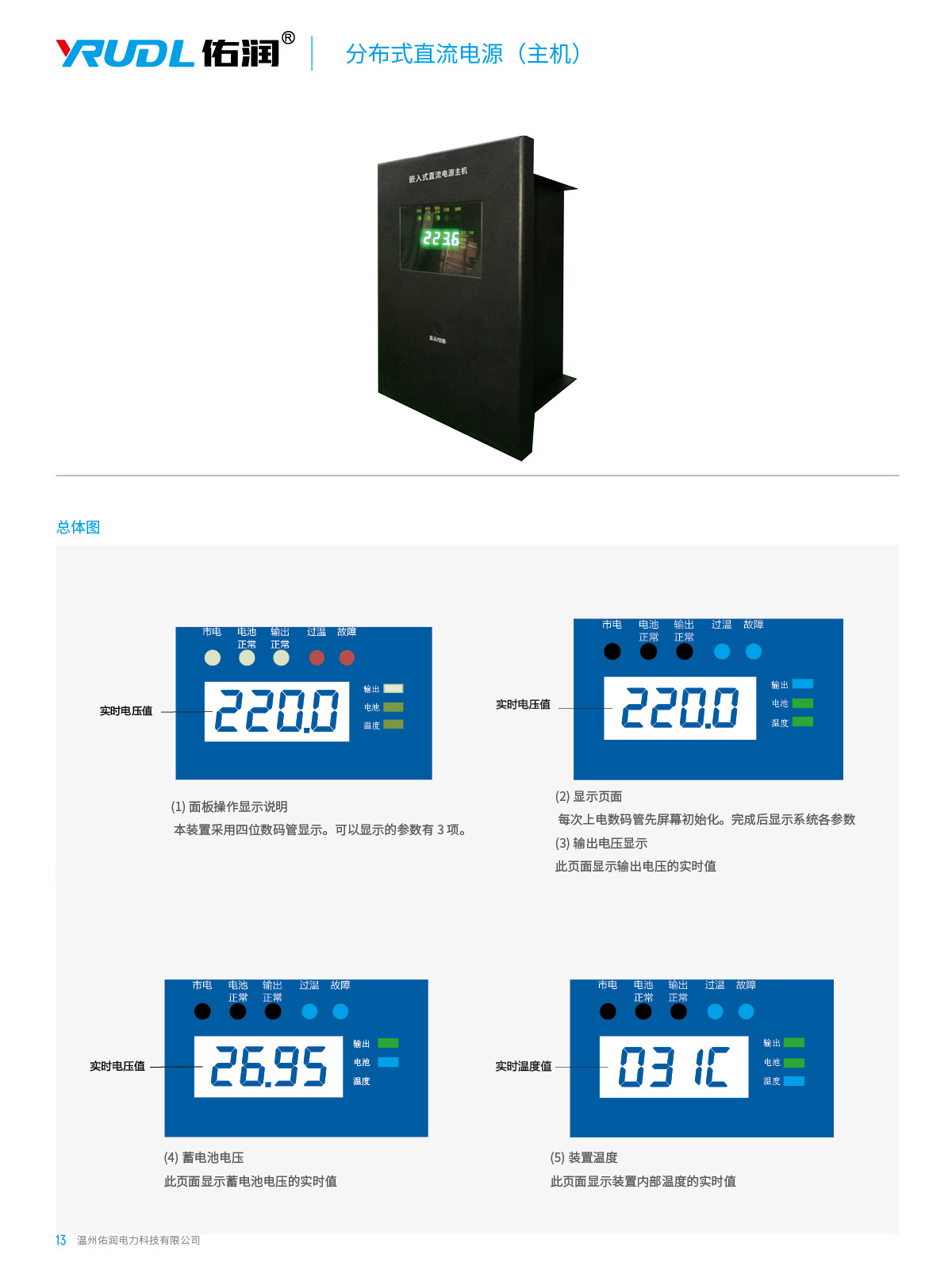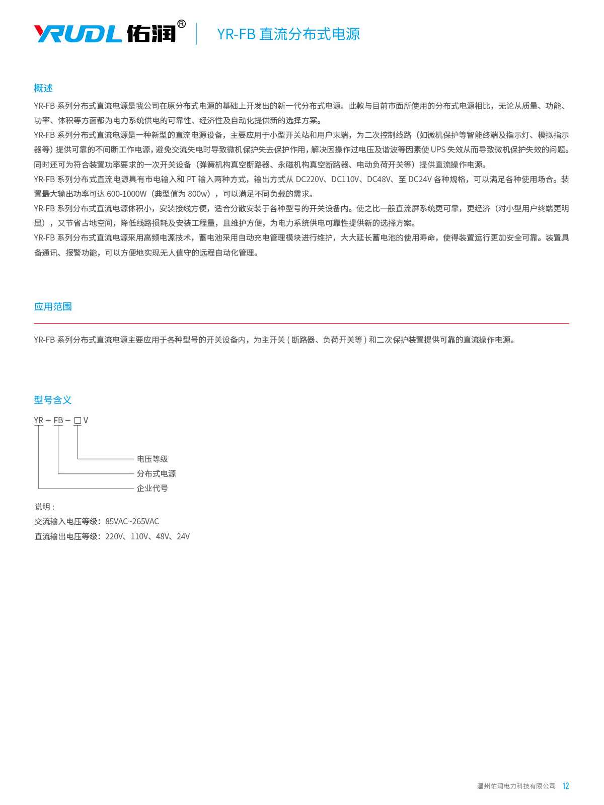 YR-FB 系列分布式直流电源是一种新型的直流电源设备,主要应用于小型开关站和用户末端,为二次控制线路(如微机保护等智能终端及指示灯、模拟指示器等)提供可靠的不间断工作电源,避免交流失电时导致微机保护失去保护作用,解决因操作过电压及谐波等因素使UPS失效从而导致微机保护失效的问题。同时还可为符合装置功率要求的一次开关设备(弹簧机构真空断路器、永磁机构真空断路器、电动负荷开关等)提供直流操作电源
