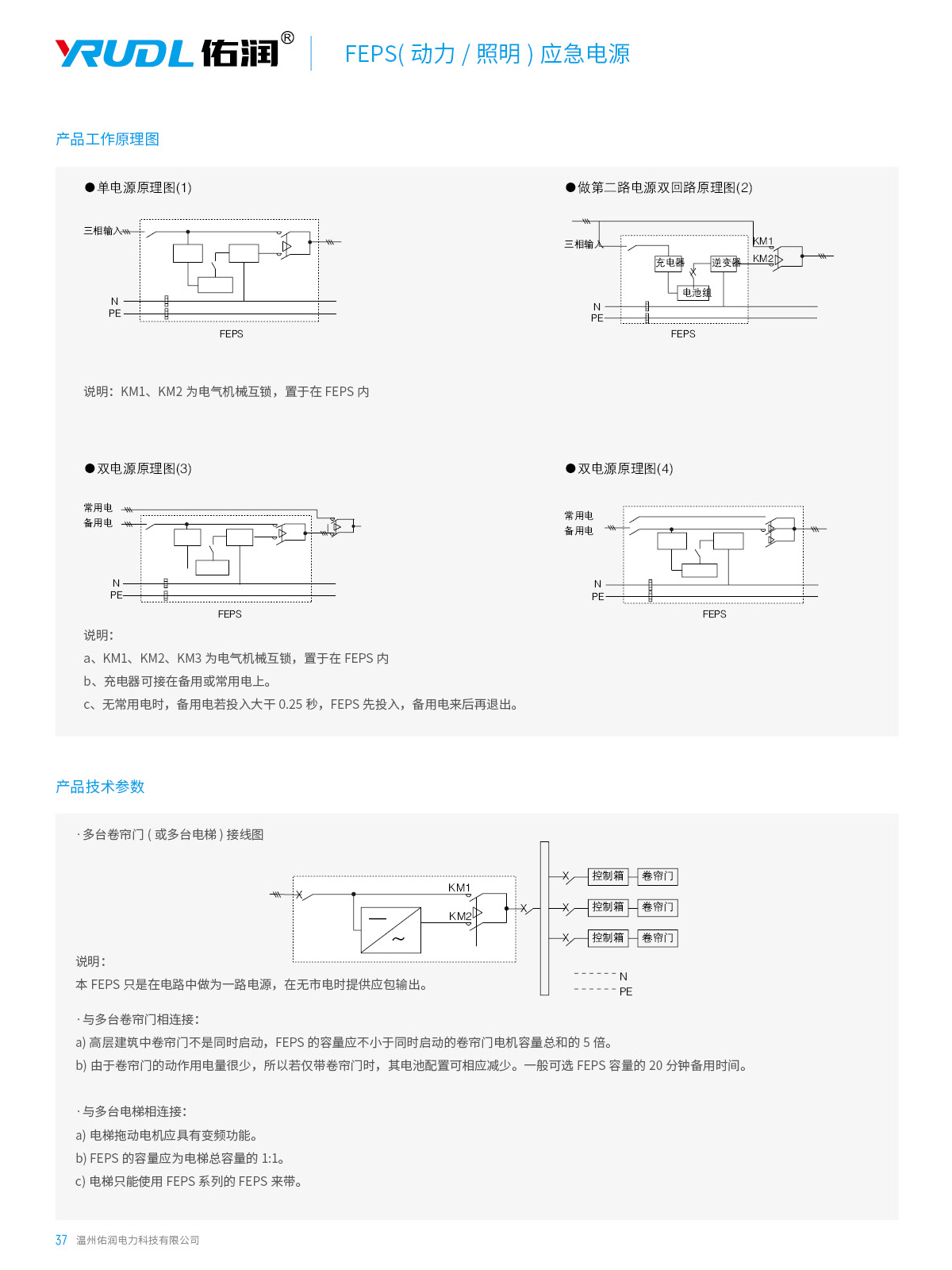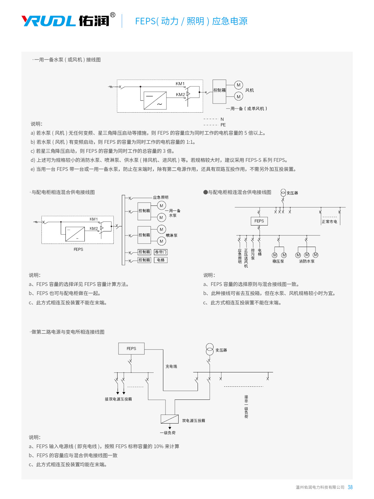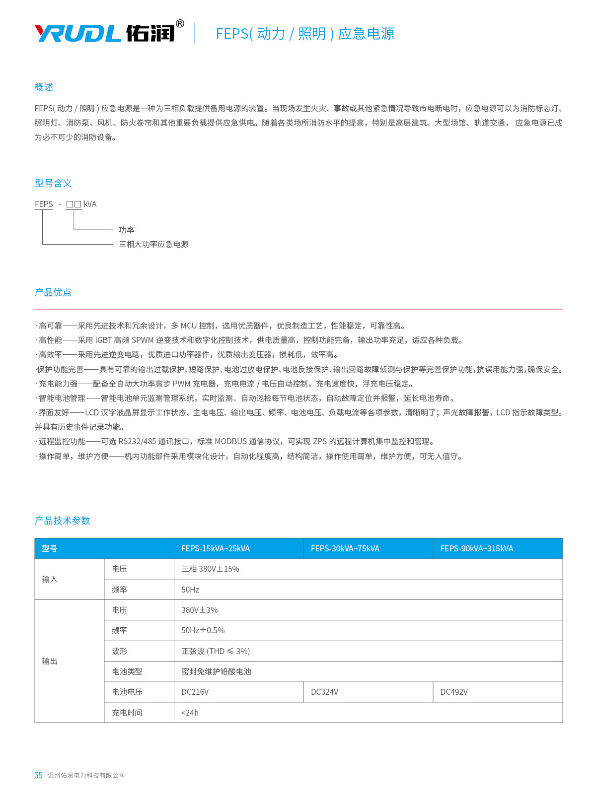FEPS(动力/照明)应急电源是一种为三相负载提供备用电源的装置。当现场发生火灾、事故或其他紧急情况导致市电断电时,应急电源可以为消防标志灯、照明灯、消防泵、风机、防火卷帘和其他重要负载提供应急供电。随着各类场所消防水平的提高,特别是高层建筑、大型场馆、轨道交通, 应急电源已成为必不可少的消防设备。